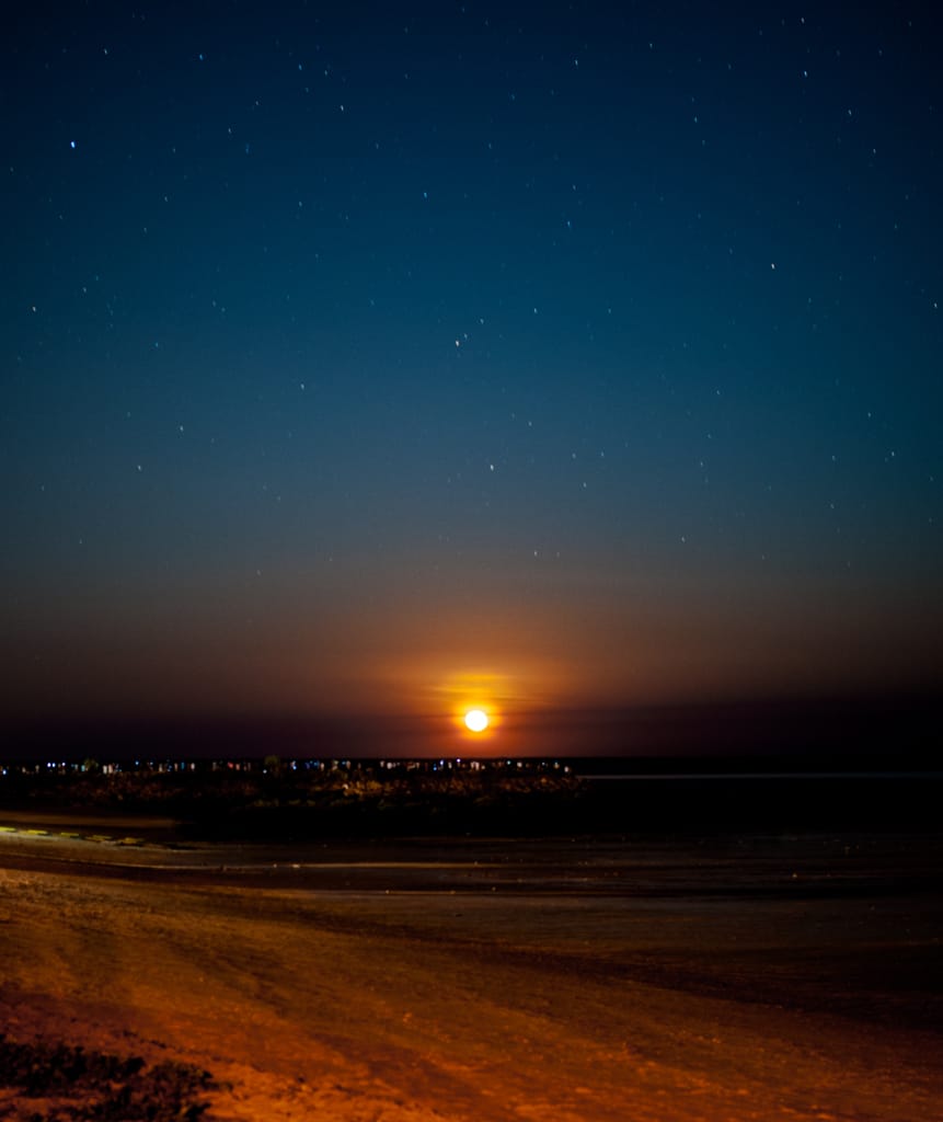 Wir hatten den absolut richtigen Zeitpunkt gefunden in Broome zu sein, denn es war Vollmond und so kann man während drei Abenden den Mond über dem Meer aufgehen sehen (Staircase to the moon). Ein wirklich traumhaftes Naturspektakel. Die genaue Zeit des Aufgangs, konnte man anhand der unzähligen Prospekte herauslesen und so richteten wir uns frühzeitig am Strand mit Kamera und Stativ ein. Man könnte meinen die Sonne geht auf: eine tiefrote Kugel erscheint am Horizont und rundherum ein Meer von Sternen. Da hatten wir wirklich Glück zur rechten Zeit am rechten Ort zu sein. Unsere Kinder waren von den ersten Mondstrahlen dermassen Erstaunt, dass sie gleich den Rest des Spektakels verschliefen und wir sie zur unserer Freude ein zweites Mal heute zum Auto tragen durften.