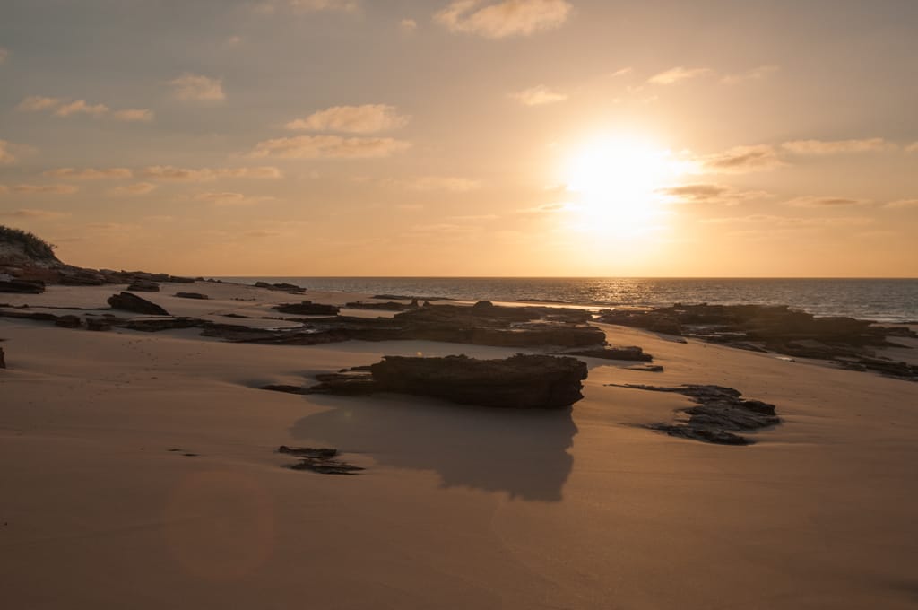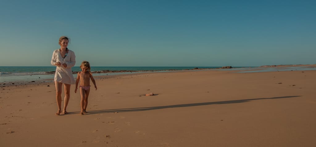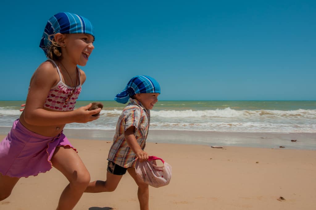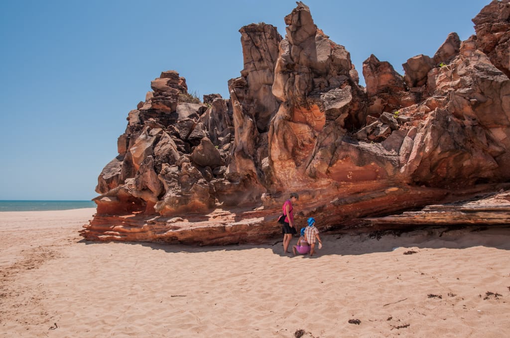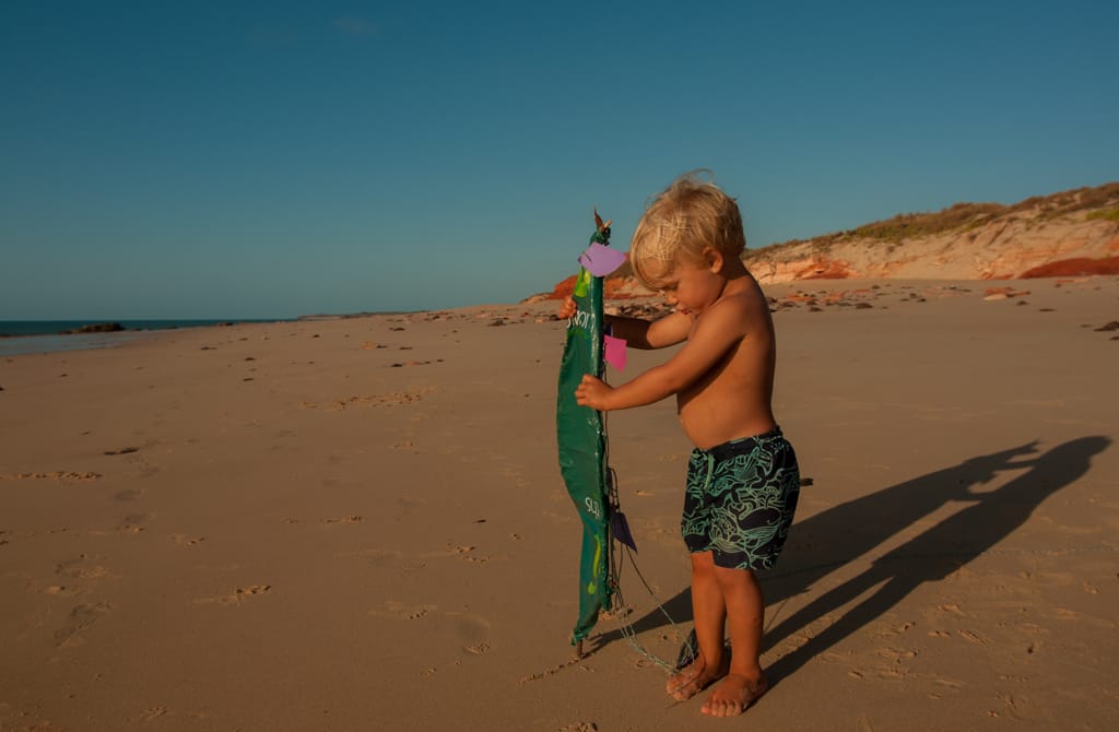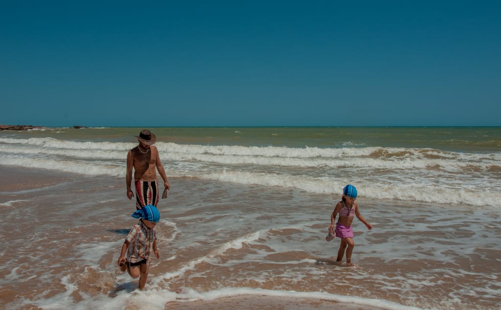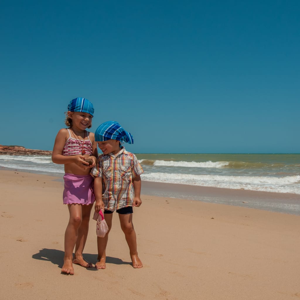 Nach der ersten Nacht in Broome wollten wir den Cable Beach so richtig geniessen und packten also alle unsere Badesachen zusammen und liefen den Fussmarsch zum Strand hinunter. Dort erwarteten uns riesige Wellen, so dass schwimmen nicht möglich war. Jedoch machte sich in die Wellen stellen und im richtigen Zeitpunkt von den Wellen an den Strand reiten lassen mega Spass. Cédric bevorzugte das „Sändele“ am Strand und so hatten wir alle eine Vormittagsbeschäftigung gefunden. Die heisseste Tageszeit verbrachten wir natürlich im Schatten auf unserem Campingplatz. Immer wieder diskutierten wir, ob wir noch länger auf dem Campingplatz bleiben sollen oder nicht, denn er befand sich nicht direkt am Strand, aber auch nicht in der Stadtnähe. So fanden wir alle, dass es besser ist am nächsten Tag an den Town Beach für eine Nacht zu zügeln. Dort befand sich der Campingplatz am Meer, wo man aber wegen den Crocs nicht baden kann, doch er ist in Stadtnähe. Da Samstag ist können wir auch gleich durch den Wochenendmarkt schlendern bei dem Kunst und Schmuck aus der Region angeboten werden. Eva kauft sich Süsswasserperlen-Ohrenringe, wie es sich gehört in Broome.
