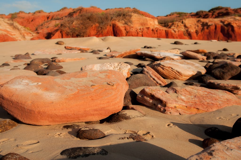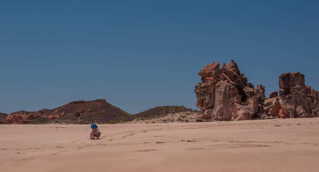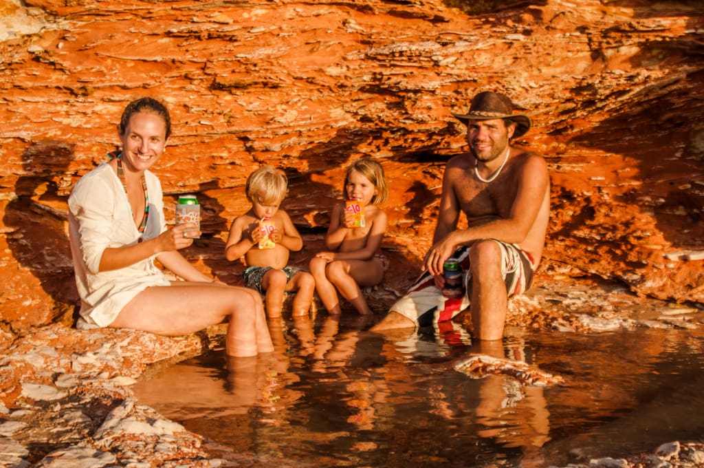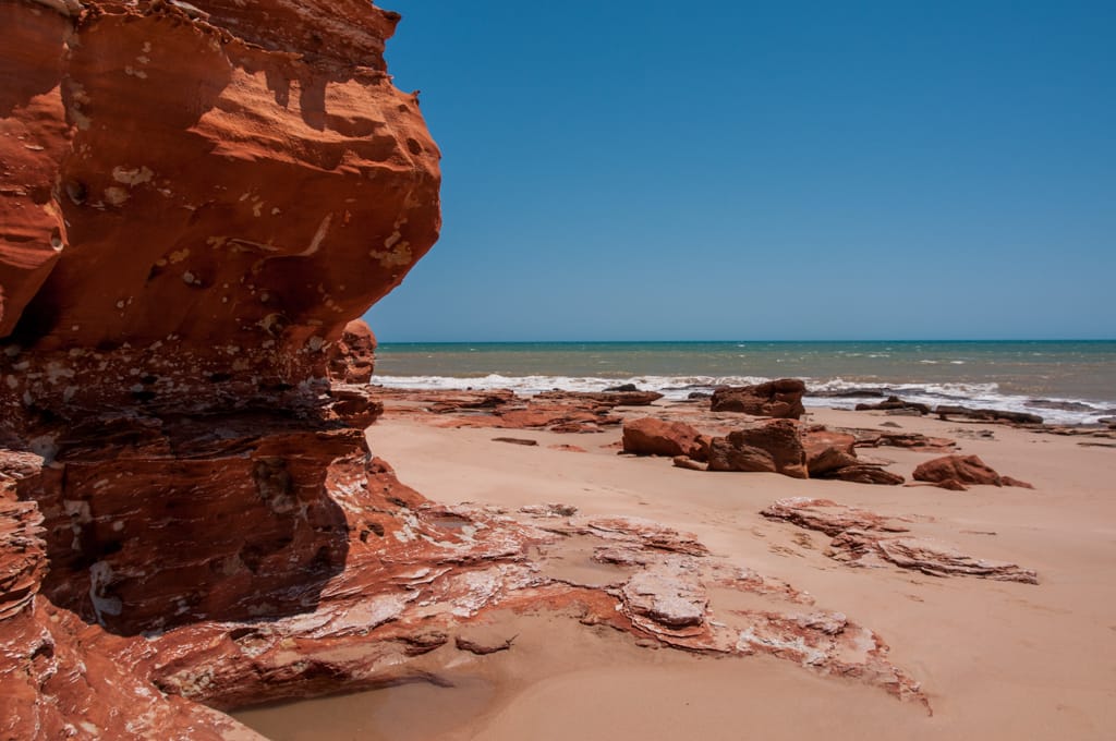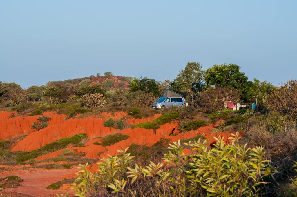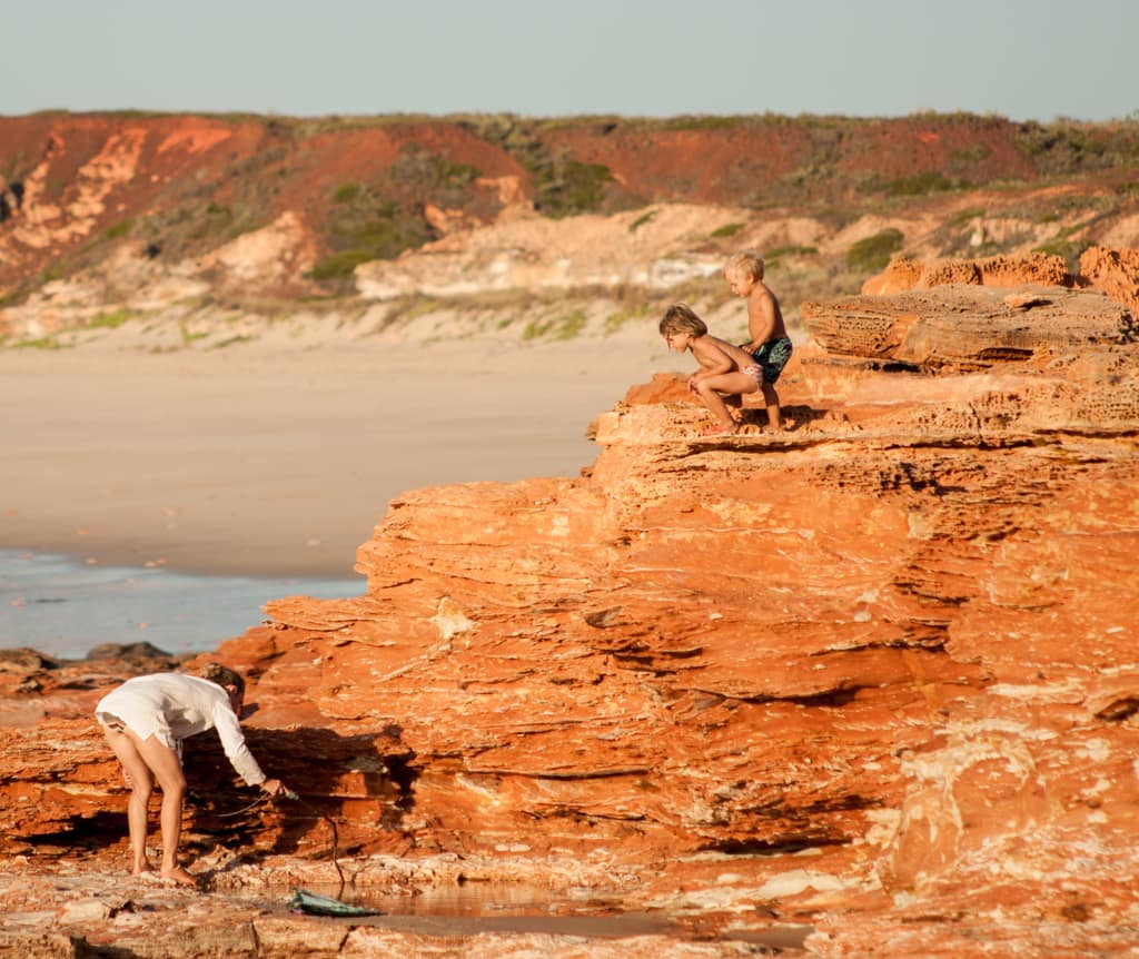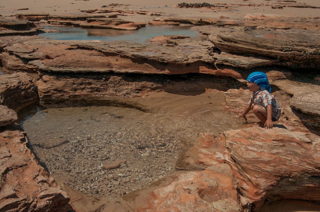 So fuhren wir am darauffolgenden Morgen mit dem Klang weiter und fanden zum Glück aber auch bald das „Ein“ wieder, so dass der Einklang wieder komplett war. Am einsamen „Eighty Mile Beach“ fanden wir einen Zeltplatz mit prächtigster Aussicht auf den Ozean und die roten Küstenfelsen. Wir verliebten uns in diesen Ort und beschlossen nun mal wirklich ein paar Tage auszuspannen. Baden konnte man hier auch, da die Saltys Mangroven brauchen und es hier ausser Felsen und hohe Wellen nichts hat. Jeweils am Abend, wenn die Ebbe schon fortgeschritten ist, tauchen in den hervorkommenden Steinen unzählige kleine Pools auf, welche rege von Krebsen, Muscheln und Fischen bewohnt sind. So waren wir mit kleinen Fische fangen und baden beschäftigt.