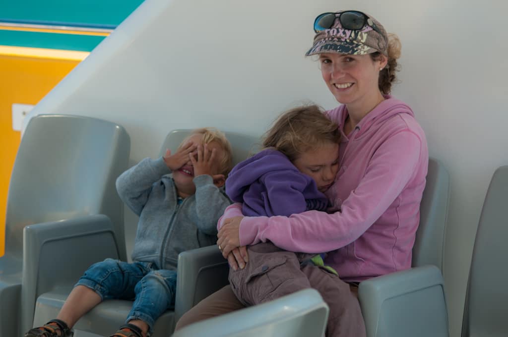 Nach einigen Schnappschüssen heisst es, wir sollen Platz nehmen, da wir noch weiter hinausfahren. Unsere Familie macht es sich zuvorderst auf dem Katamaran gemütlich. Jedoch wird es Cédric ziemlich schnell zu ungemütlich… Es ist heute sehr windig und das Meer sehr wellig. Das Schiff schaukelt extrem hin und her, ab und zu werden wir sogar nass. Zoé ist begeistert und ruft: „Da isch jo wie ufere Achterbahn!“ und Cédric jammert: „I wött heigoh!“ Er kuschelt sich aber bald in mich hinein und wird in den Schlaf geschaukelt. Einige andere Passagiere denken wohl dasselbe wie Cédric, denn sie sind kreidebleich und halten ihre Kotztüten vor sich. Als Cédric seine Augen wieder öffnet, liegt unser Schiff wieder mehr oder weniger ruhig im Wasser. Wir können immer wieder kleine Gruppen von 2 oder 3 Buckelwalen, manchmal begleitet von Delfinen, bestaunen. Sie winken mit ihren Brustflossen, lassen ihre Schwänze ins Wasser klatschen, strecken ihre Köpfe aus dem Wasser, drehen sich und stossen immer wieder Atem aus. Manchmal tauchen sie ganz Nahe beim Boot auf bzw. ab. Zum Schluss können wir sogar 3 Wale beobachten die aus dem Wasser hinausspringen. Ich könnte ihnen stundenlang zuschauen. Die ganze Familie ist begeistert (nun auch Cédric), aber gegen Mittag nimmt unser Katamaran wieder seinen Kurs auf entlang von Fraser Island. Hier erblicken wir nun atemberaubende Strände. In einer ruhigen Bucht halten wir fürs Mittagessen an. Alldiejenigen, die ohne weisse Tüte auskamen, können sich am feinen Buffet bedienen. Bei der Rückfahrt entdecken wir die Treppe zur Kufe hinunter und verbringen so die letzten Minuten noch ohne grossen Wellengang mit Blick durchs Unterwasserfenster. Der Ausflug, mein vorgezogenes Geburtstagsgeschenk, hat sich wirklich gelohnt!