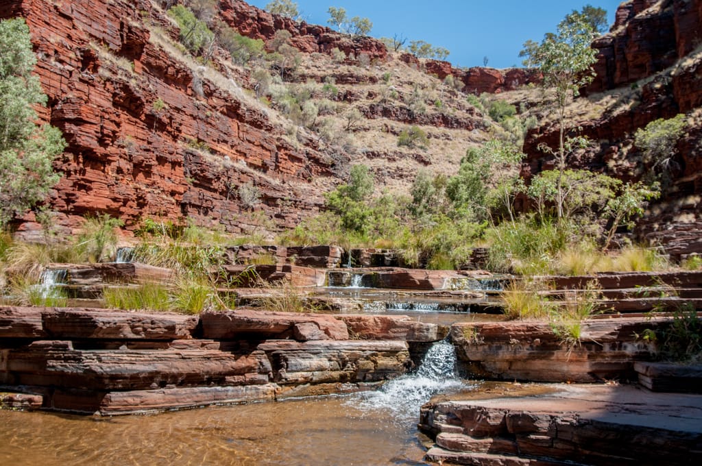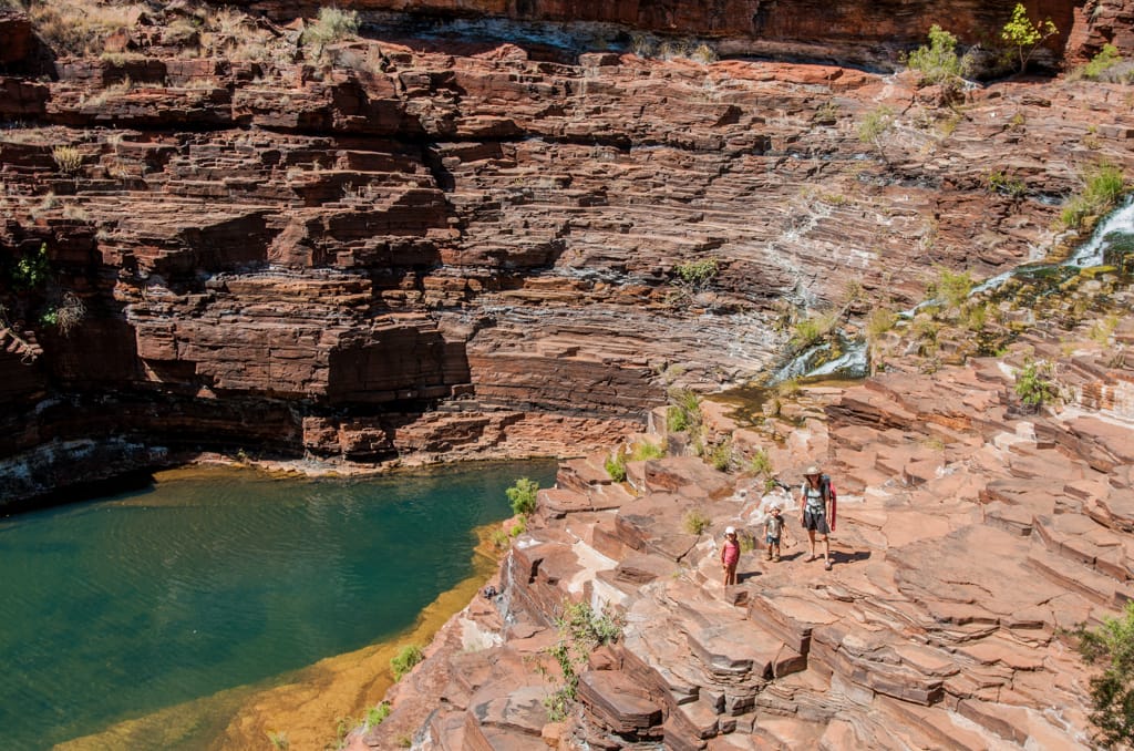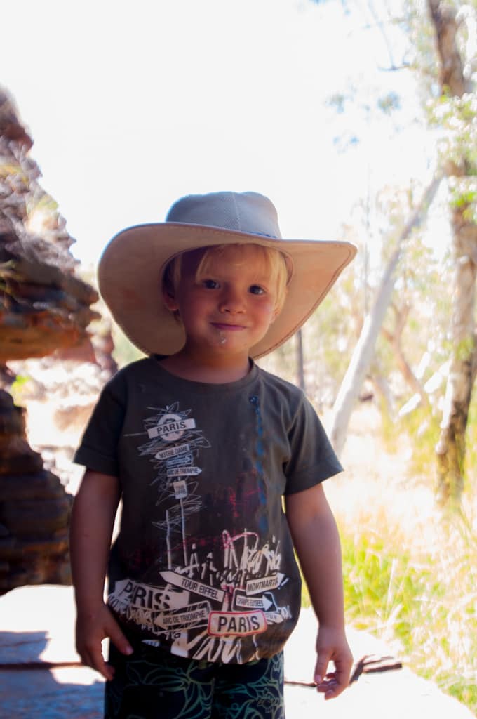 Am Nationalpark angekommen mussten wir die Eintrittsgebühr in die aufgestellte Kasse werfen und schon konnten wir den ersten natürlichen Badepool anfahren. Grosse Tritte die Schlucht hinunter stellten für Cédrics kurze Beine eine Herausforderung dar, doch er meisterte den Abstieg tadellos. Fast am Pool angekommen trafen wir auf das Schweizer Paar von der Barnhill Station. In einem kurzen Erlebnisaustausch erfuhren wir, dass sie gleich vor uns im Roadhouse die Gasflasche auffüllen liessen und es bei ihnen eine immens grosse Tortur gewesen war. Von geht nicht, über keine Ahnung welche Füllmenge klappte es bei Ihnen nach langer Zeit dann doch auch noch. So bedankte ich mich recht herzlich bei Ihnen, dass sie vor uns da waren und die Vorritterrolle übernommen hatten.