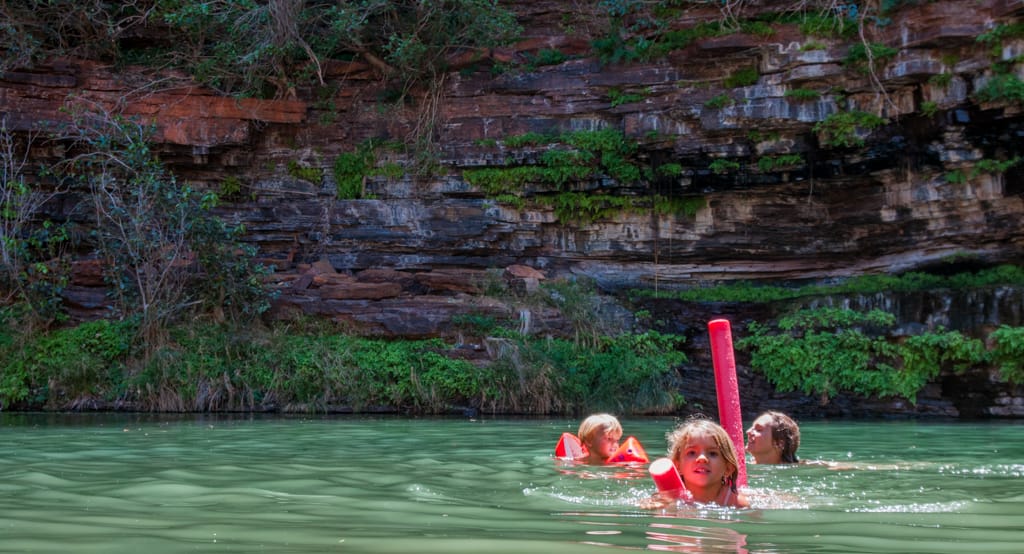 In diesem Nationalpark befinden wir uns einmal mehr an einem einmaligen Ort, wie es ihn nur auf dem Roten Kontinent gibt. Verschiedene Pools liegen verteilt unter Wasserfällen in Schluchten. Manche einfach zugänglich, andere schwieriger bieten eine angenehme Abkühlung in diesen heissen Tagen. Auf einem einfachen Campground buchten wir uns für zwei Nächte ein, um diese Schluchten mit Baden und Wandern genau erkunden zu können. Märchenhafte Eindrücke von Pflanzen, Felsen und Wasserläufe werden uns geboten und da entpuppen sich Zoé und Cédric einmal mehr seit wir hier in Australien sind als gute Läufer. Ein mehrstündiger Wanderweg über hohe Felsen und Gesteinsbrocken meistern sie problemlos. Die Zwischendurch vorkommenden Wasserdurchgänge lieben sie besonders. In der Nacht hört man von fern die wilden Dingos bellen und so erleben wir das Australien wieder, wie wir es uns während der Vorbereitungszeit erhofft hatten.