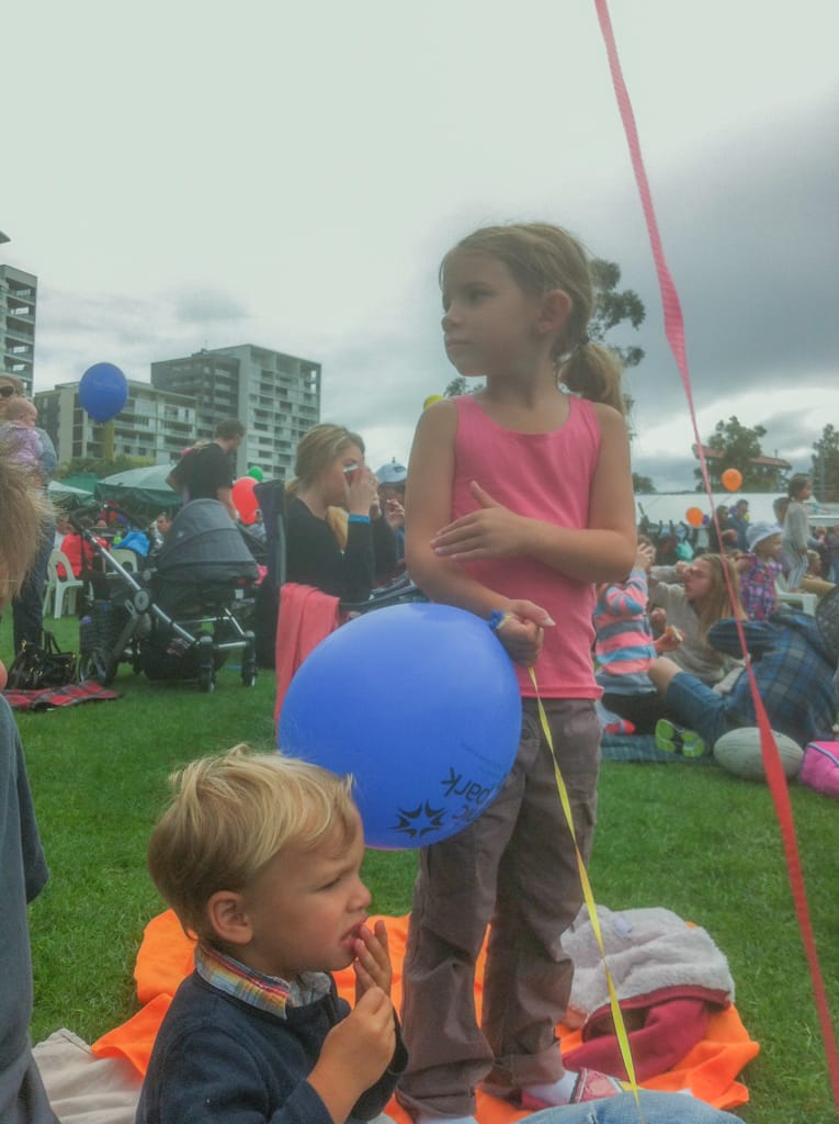 Heute zum Beispiel fand ein „picnic in the park“ statt: Ein kleines Gratis-Festival im Roma Street Parkland. Alle Einnahmen kamen Behinderten-Institutionen zu Gute. Als wir nach dem Mittag kamen, lief gerade eine Kinderliveshow mit viel Tanz und Gesang. Eine Frau am Rande der Bühne übersetzte in die Taubstummensprache. Die Kinder bekamen Ballone, durften einen neuen Toyota Hybride anmalen oder konnten sich unter anderem im „Gumpischloss“ austoben.