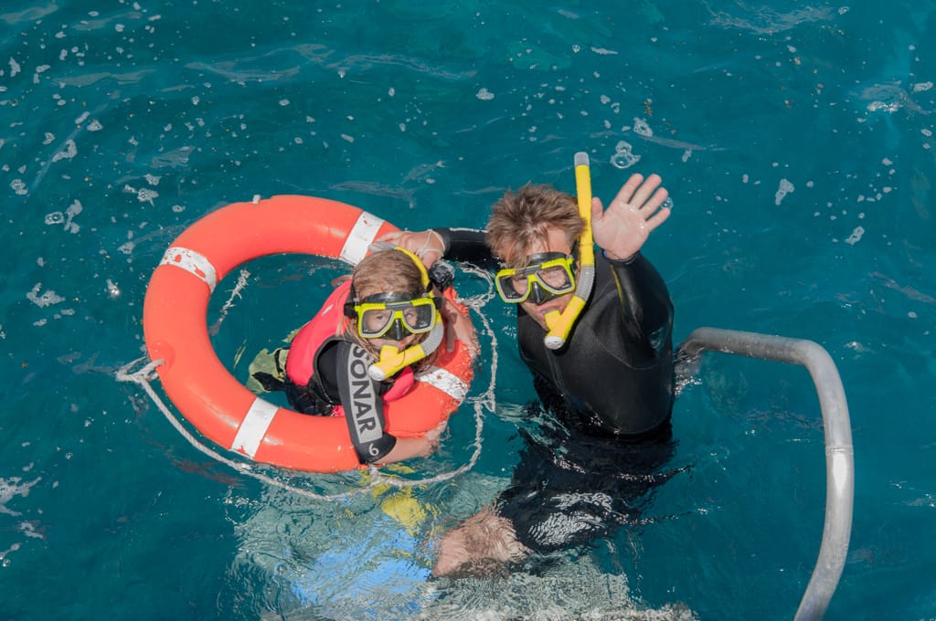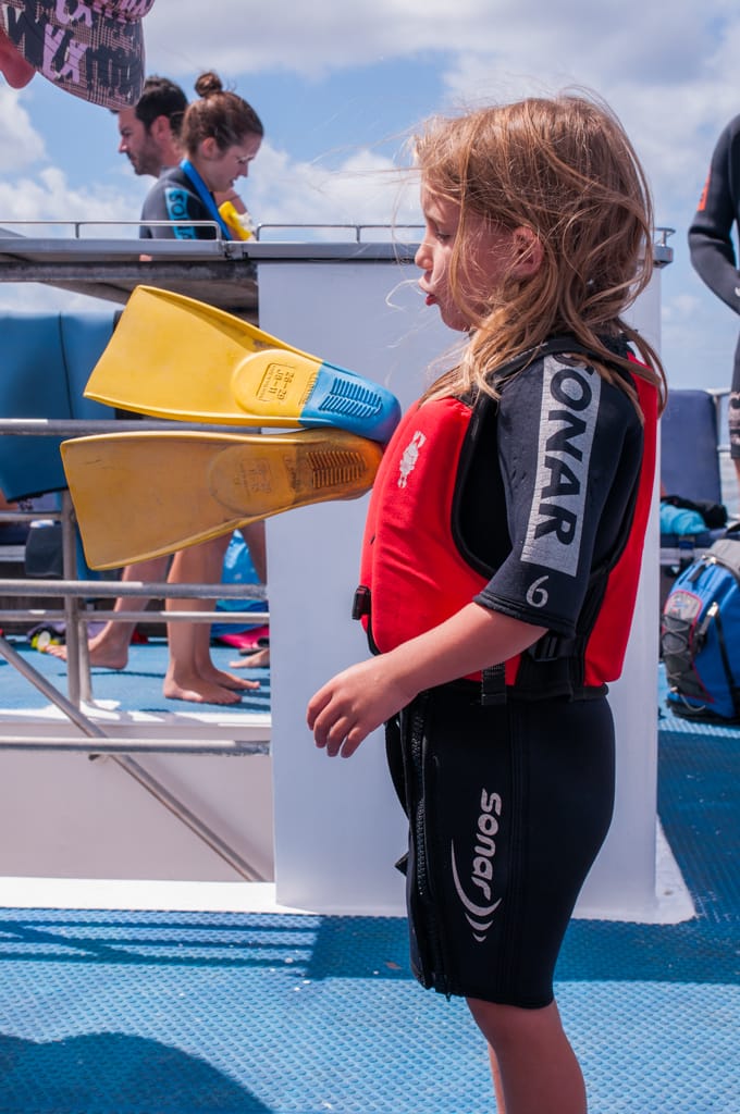 Für den Sonntag haben wir uns eine Great Barrier Reef-Tour ausgesucht. Deshalb standen wir vor Sonnenaufgang mit dem herrlichen Gezwitscher australischer Vögel auf. Um 7.05 Uhr brachte uns ein Shuttle-Bus zum Hafen (Cédrics Highlight). Noch bevor wir an Bord durften, wurde uns eine Nummer zugeteilt (für Kontrollzwecke). Dann wurden wir Vier gleich mit Flossen, Taucheranzug, Schnorchel und Taucherbrille ausgestattet. Die Kinder erhielten zusätzlich eine kleine Schwimmweste. Nach dem Ausfüllen einiger Formulare legte das Schiff ab und nahm Kurs zum ersten Halt. Auf der Überfahrt konnten wir frühstücken und es wurden uns viele Anweisungen für Notfälle erläutert. Ausserdem erhielten wir Tipps zum Schnorcheln und eine kleine Einleitung fürs Tauchen. Im Preis inklusiv war ein Schnuppertauchgang. Zusammen mit 3 Anderen wurde ich gleich in die erste Gruppe eingeteilt. So ganz wohl war mir der Gedanke, ins Meer abzutauchen nicht. Mir ist noch gut in Erinnerung als ich auf den Galapagos beim Schnorcheln von Seehund, Schildkröte und Pinguin umzingelt wurde. Nun ja, heute, wieder ein Jahr älter, wollte ich was Neues wagen. Nach dem ersten Eingewöhnen mit dem Atmen war ich bereit in die Tiefe zu gehen. Leider hatte ich jedoch Mühe mit den Ohren. Es gelang mir nicht richtig, den Druck auszugleichen. So entschied ich mich bald aufzutauchen. Den Rest der Familie fand ich gleich am Schiffsrand beim Einstieg ins Wasser. Die Kinder trauten sich noch nicht so ganz ins kühle Nass hinein. Zoé kam dann aber mit einem Rettungsring ins Meer und war sofort begeistert, als sie durch ihre Taucherbrille Fische entdeckte. Cédric bevorzugte es am Rand zu sitzen und mit einer Schwimmnudel zu „fischen“. Während Martin eine Schnorcheltour unternahm, wagten Zoé und ich uns auch ans Riff und guckten den verschiedenen Fischen zu. Das Riff selbst hatte ich etwas schöner erwartet, farbiger. Ich hatte den Eindruck, dass doch schon vieles kaputt war. Es hatte aber wirklich viele Fische und es war berührend zu sehen, wie viel Spass Zoé beim Schnorcheln hatte. Es tat sich eine neue Welt für sie auf.