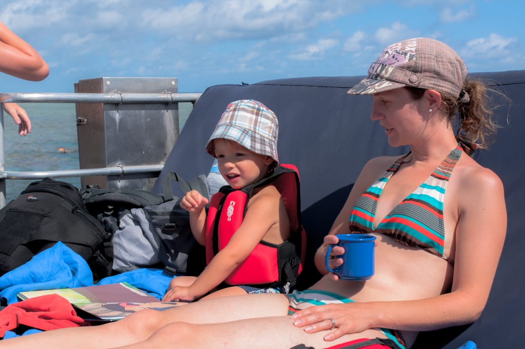 Die Kinder und ich durften während dieser Zeit eine kleine Bootstour mit einem Glasbodenschiff unternehmen. So konnte Cédric auch einige Fische entdecken und wir fanden sogar Nemos Familie und sein Zuhause. Zurück auf dem grossen Schiff, gab es das feine Mittagessen und wir fuhren an einen zweiten Ort. Cédric nutzte das für sein Mittagsschläfchen und Zoé konnte es kaum erwarten wieder ins Meer zu springen. Sie schnorchelte ausgiebig, abwechselnd mit Martin oder mir. Bei der Rückfahrt nach Cairns stiessen wir auf meinen Geburtstag an. Obwohl das Great Barrier Reef weder Martin noch mich umgehauen hat (Sicherlich gäbe es noch schönere Abschnitte, wenn man bedenkt, dass das Great Barriere Reef dieselbe Fläche wie Deutschland aufweist. Aber wenn man Galapagos gesehen hat, kann dies wohl kaum mehr getoppt werden), fanden wir es einen schönen Ausflug, der sich absolut gelohnt hat. Aber mein heutiges Highlight war nicht irgendein Tier, sondern unsere Tochter!