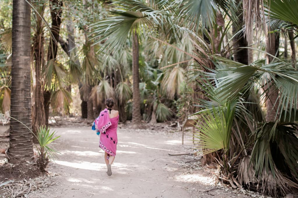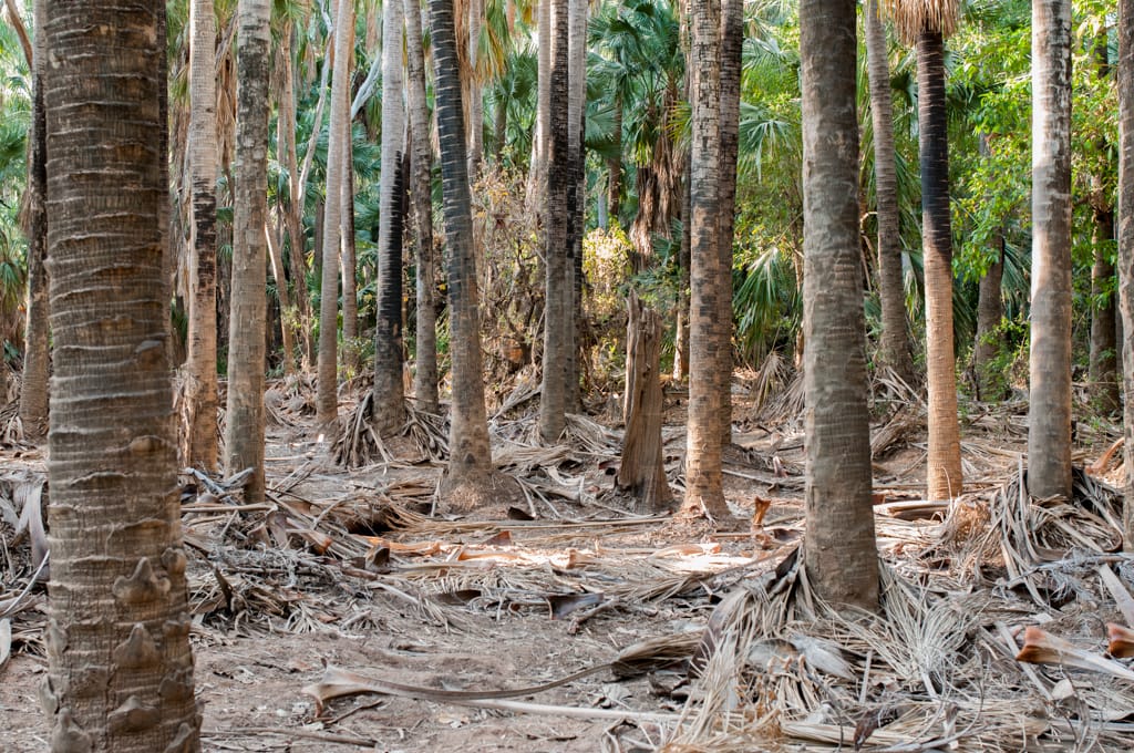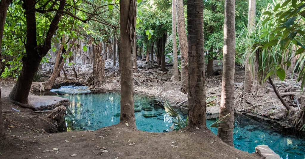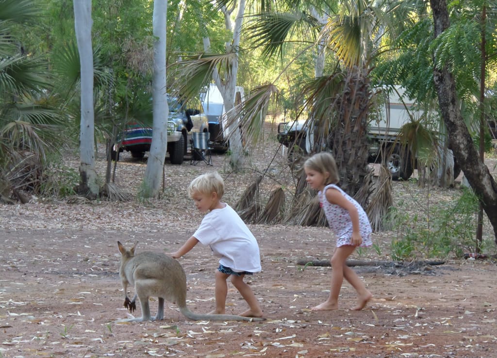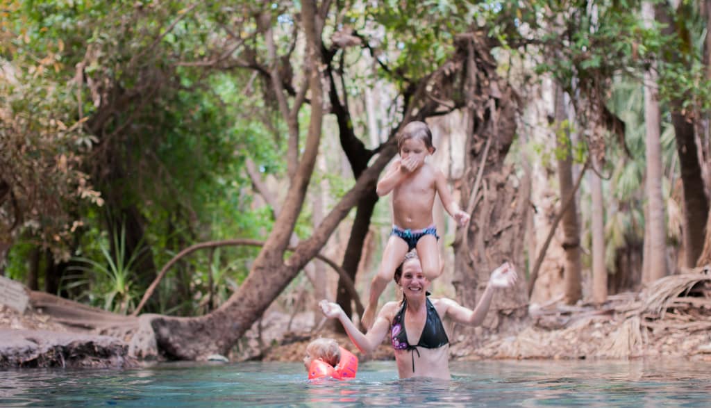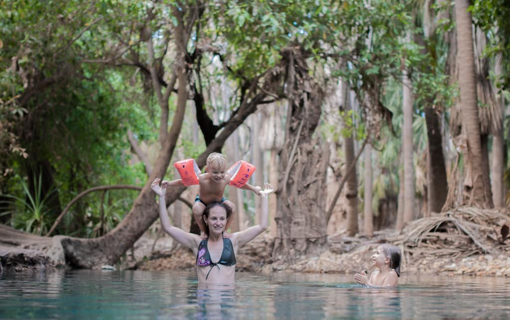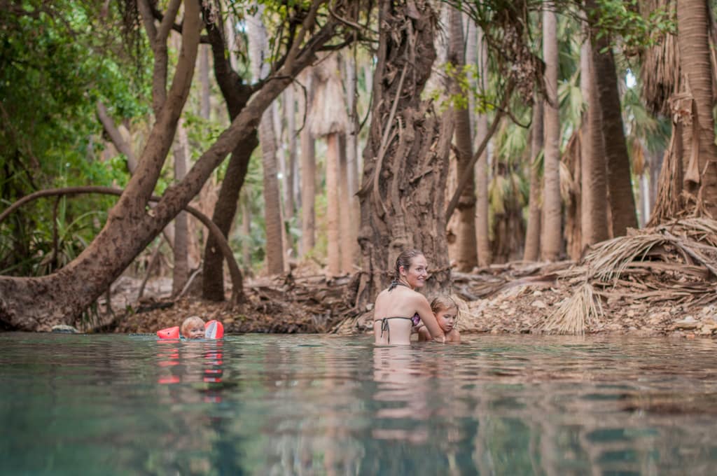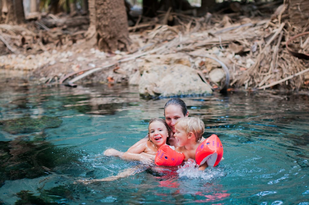 Nach einem gemütlichen Pancakes-Frühstück machen wir uns weiter auf unseren Weg. Bis nach Mataranka dauert es zwar nur etwas mehr als eine Stunde, dennoch haben wir langsam genug von diesen Weiten Australiens. Die Autofahrt ist sehr öde. Zum Glück machen es Zoé und Cédric so gut. Nach der geraden, langweiligen Fahrt werden wir jedoch mit einem kleinen Paradies verwöhnt. Mitten in dieser Baumwüste landen wir in einer grünen Oase mit einer palmenumgebenen warmen Wasserquelle. Die Quelle sprudelt etwa 34 Grad warmes Wasser hinaus und einige Meter weiter unten wurde ein sehr schöner grosser Pool angelegt. Er diente im zweiten Weltkrieg (nur!) den Offizieren als Erholung. Der Pool liegt im Elsey Nationalpark, der wiederum Heimat von etwa 250’000 Flughunden (Flying Fox) ist. Momentan sind sie aber nicht im Wald, was unser Glück ist. Sie werden Ende des Monats erwartet und der Nationalpark wird dann gesperrt. Da es so viele Flughunde sind, brechen dauernd Palmenblätter ab, was zu gefährlich für Fussgänger wäre. Wir können sie dennoch beobachten, da sie kurz vor 19 Uhr über uns hinwegfliegen. Was für ein Schauspiel! Der Campingplatz liegt nur etwa 100 Meter von der warmen Quelle entfernt. Das Wetter ist so heiss, dass wir 2 Tage sozusagen im Wasser verbringen. Zoé hat nun definitiv das Schwimmen und Tauchen entdeckt. Die Schwimmflügeli können wir wegwerfen.