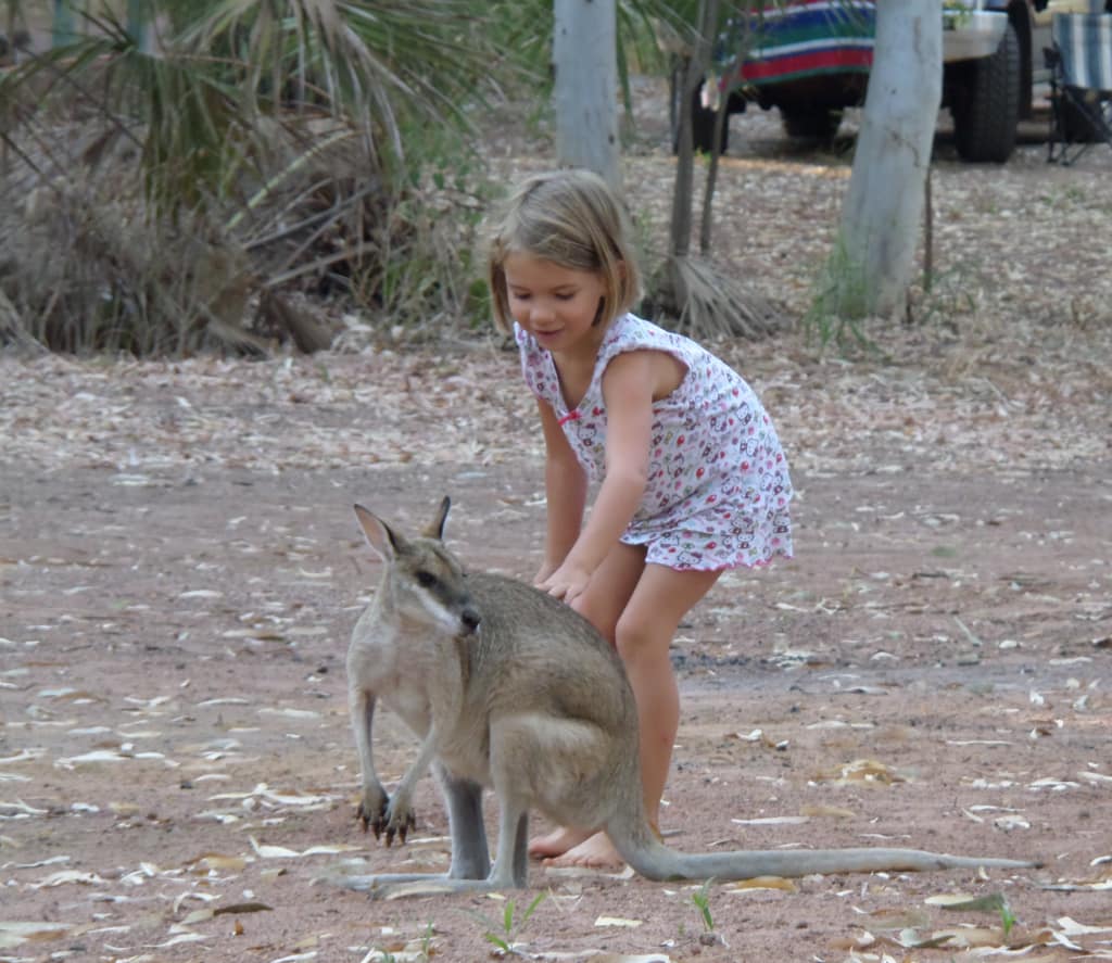 Abends knistert bei uns das Lagerfeuer. Zwei Wallabies gesellen sich zu uns und hoffen wahrscheinlich auf Futter. Sie wissen nicht, dass wir gerade leckeres Kängurufleisch grilliert hatten… Am Morgen fotografierte ein Nachbar Zoé und Cédric mit einem Känguru und brachte uns die Fotos.