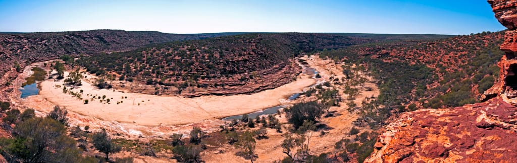 Sobald uns die Sonne weckte, packten wir zusammen und fuhren in den Kalbarri National Park. Auf dem Parkplatz dort stärkten wir uns mit einem Müesli und wir merkten schnell, dass das Thermometer in die Höhe schiesst, obwohl es uns an der Küste relativ frisch vorkam. Mit den Wanderschuhen an den Füssen machten wir uns auf zum Naturs Windows. Wir bestaunten die schöne Landschaft, entdeckten ein paar blühende Wildblumen und konnten ein Wildschwein beobachten, das im Flussbett an einem Wasserloch trank. Die Hitze und wieder einmal die Fliegen liessen unsere Pläne schnell ändern. So wurde nichts aus der grossen Wanderung, sondern nach der Aussicht beim natürlichen Fenster gings gleich wieder zurück ins Auto.