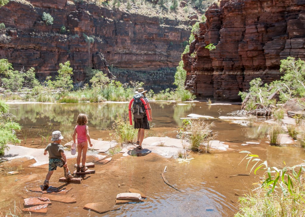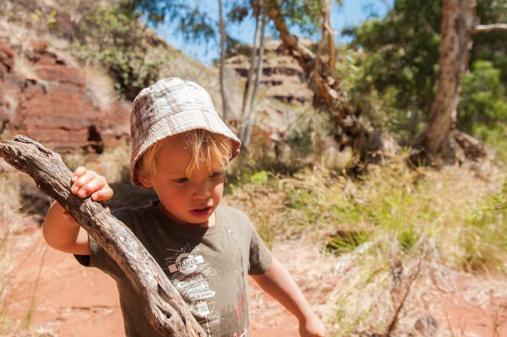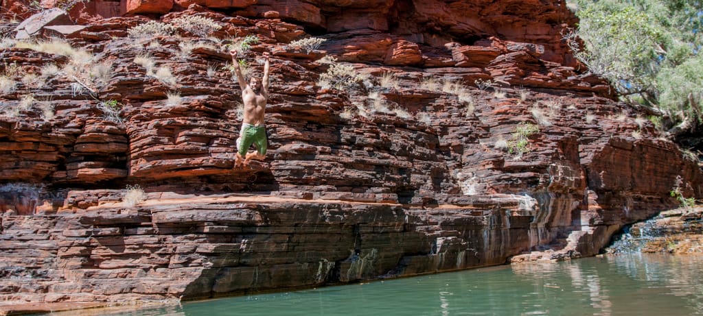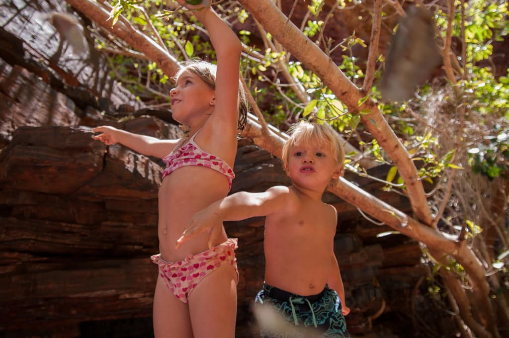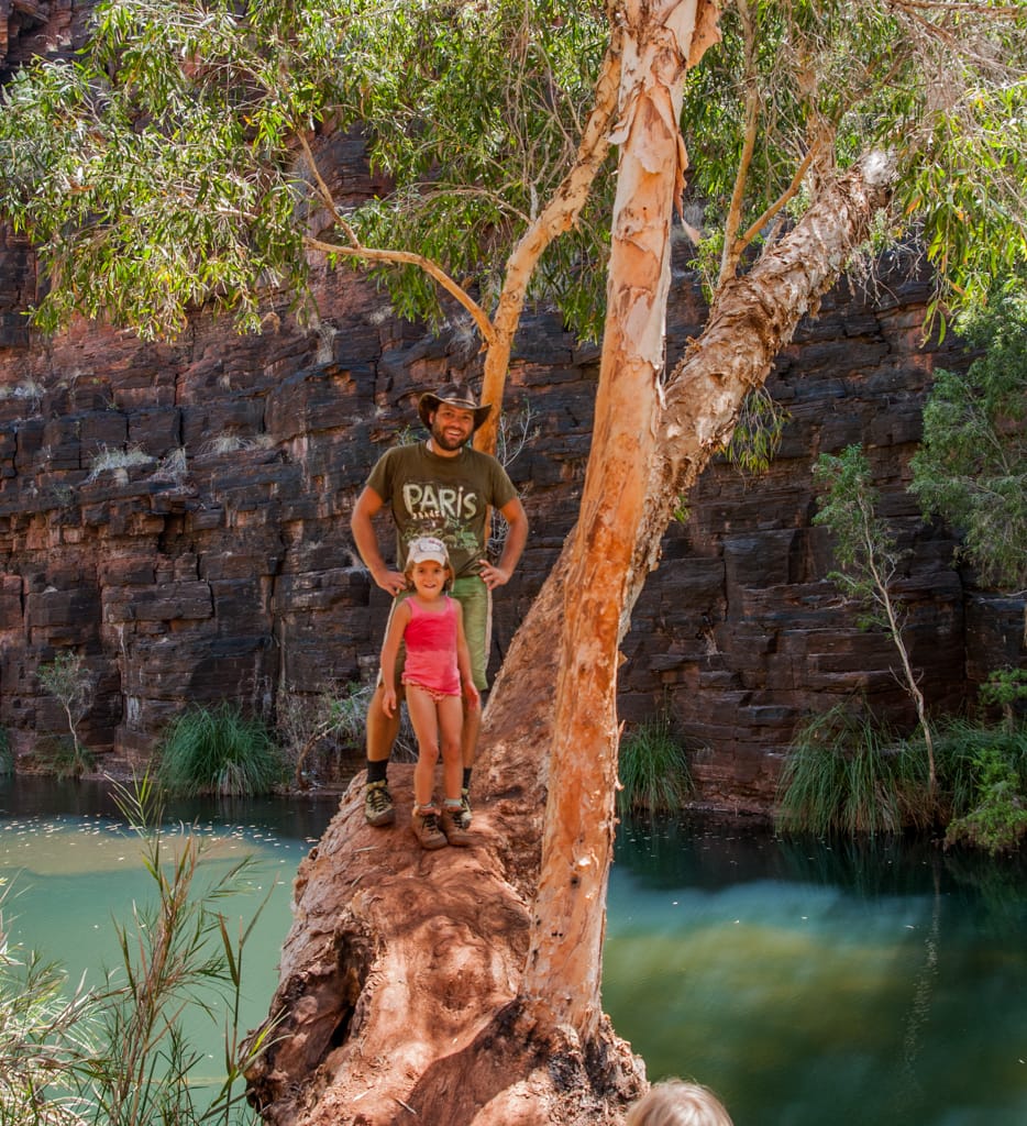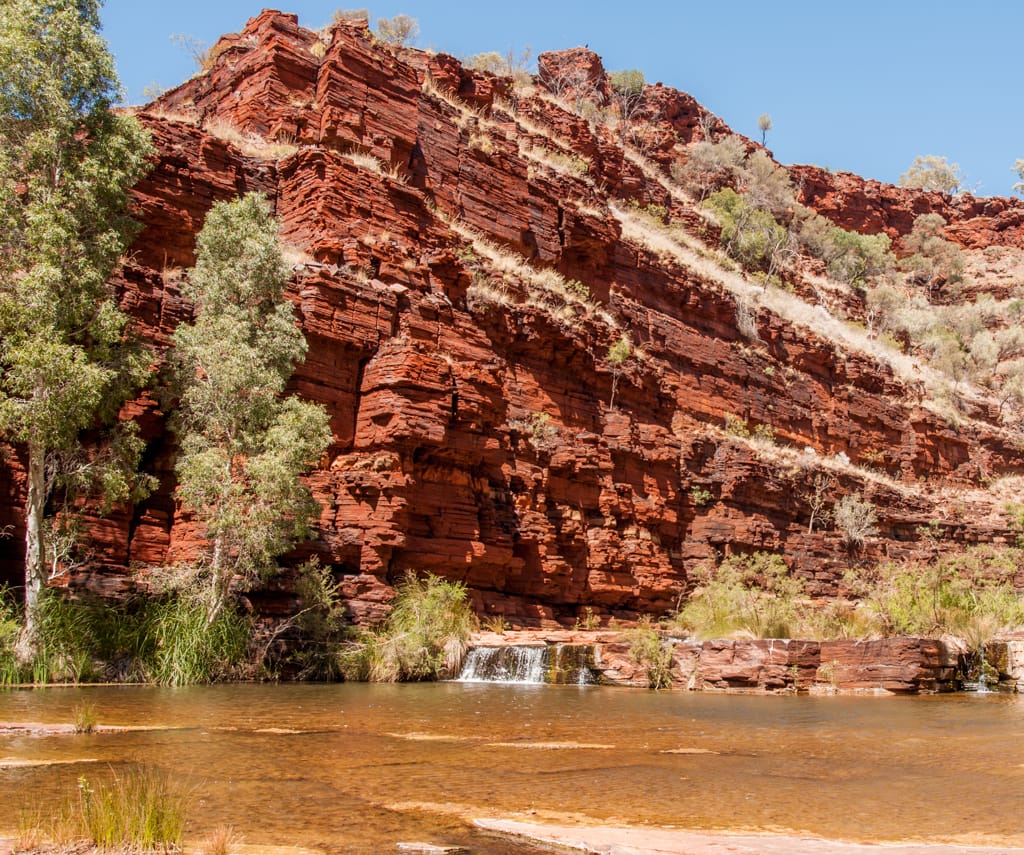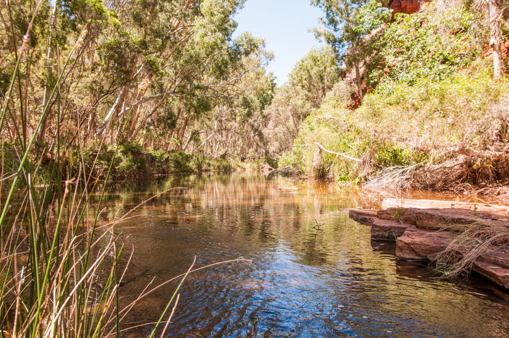 Nachdem wir gestern die Dales Gorge ausgiebig erkundeten und uns im Fern Pool, im Circular Pool und bei den Fortescue Falls abgekühlt hatten, wollten wir heute eine zweite Schlucht besuchen. Wir entschieden uns für die Kalamina Gorge, in der wir nach 400 m zu dem Hamersley Waterfall gelangten. Zu unserer grossen Freude konnten wir dieses Becken ganz für uns alleine geniessen. Für das Mittagessen fuhren wir Richtung Oxer Lookout. Wegen der Hitze entschieden wir uns dann aber gegen eine zweite Wanderung, verliessen schon bald diesen magischen Nationalpark und machten uns auf den Weg wieder Richtung Küste. Beim Beasley River fanden wir einen schön gelegenen und ruhigen Rastplatz für die nächste Nacht. Nach dem Nachtessen kamen wir mit Wendy und Peter ins Gespräch, zwei graue Nomaden, wie die herumreisenden Pensionierten hier genannt werden. Sie wohnen etwas südlich von Perth und ziehen jedes Jahr in den kälteren Monaten (Juni – November) umher, vorzüglich in wärmere Gebiete. Ihr Ziel ist es jedoch, jede australische Strasse mal zu befahren. Wir bekommen eine lustige Einführung in den Aussie-Slang und die Gelegenheit, ihren riesigen Wohnwagen zu besichtigen und staunen über die Ausstattung inklusive Waschmaschine und den grossen Wassertank (400l – da scheint unser Tank mit 30l doch nicht so australientauglich…). Sie erzählen uns einem Schweizer Tourist, der mit seinem 16-Jährigen Sohn eine Tageswanderung hier in der Gegend machen wollte. Sie nahmen viel zu wenig Wasser mit und während es der Vater knapp zurückschaffte, verdurstet der Sohn in der Hitze.