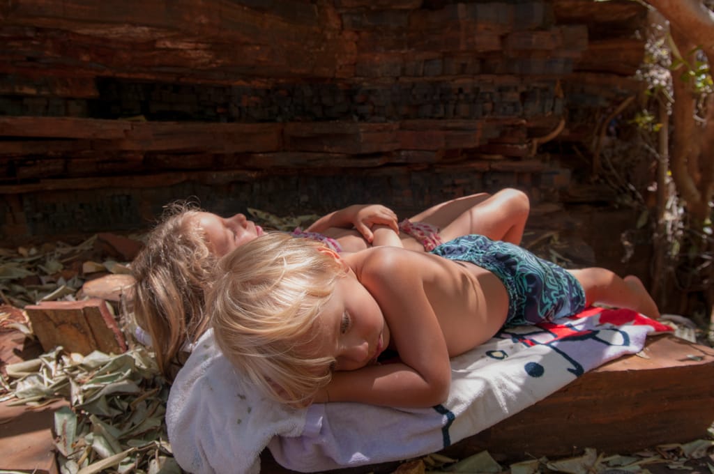 Eigentlich wollten wir direkt in den Cape Range Nationalpark fahren und hielten in Exmouth um unsere Vorräte aufzufüllen. Wie es der Zufall wollte trafen wir hier zum dritten Mal auf das Schweizer Paar, Sandra und Marc. Wir erfuhren von ihnen, dass im Nationalpark alles ausgebucht sei (es sind Frühlingsferien!) und man um 6 Uhr in der früh dort sein muss, um einen Platz ergattern zu können. So entschieden wir uns für das gleiche und uns in Exmouth auf dem Big4 Campingplatz niederzulassen und per Tagesausflug in den Nationalpark zu gehen. Erfreut über den günstigen Platz und die schöne Anlage, fühlten wir uns wie in einem Luxusresort und waren doch sehr froh, wieder mal den rotbraunen Staub richtig von uns duschen zu können. Wir genossen die relaxten Tage, die Kinder das abendliche Openairkino und wir zwei Abende in netter Gesellschaft mit Sandra und Marc. Völlig entzückt, dass hier bei diesem Platz alles stimmt und keine Insekten oder sonst etwas uns das Leben erschwert, erfuhren wir heute Morgen doch noch einen Haken. Ich wollte den Platz um eine Nacht verlängern, da wir unterdessen für den Samstag einen Platz im Cape Range Nationalpark online reservieren konnten. Da stellte sich heraus, dass beim Einchecken ein Fehler unterlaufen war und wir nur für zwei statt drei Nächte bezahlt hatten. Statt den vermeintlichen 27 AUD kostet der Platz nun 45 AUD und so hätte ich für die weitere Nacht noch 90 AUD (nach-)zahlen müssen. So entschieden wir uns nun gegen eine Verlängerung und versuchen morgen wie geplant auszuchecken und einen neuen Schlafplatz für eine Nacht zu finden.