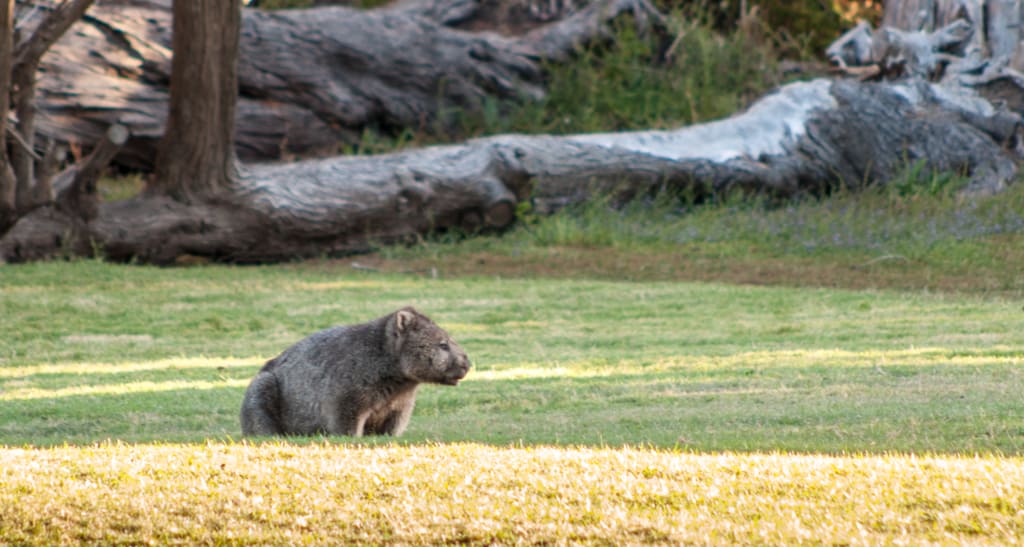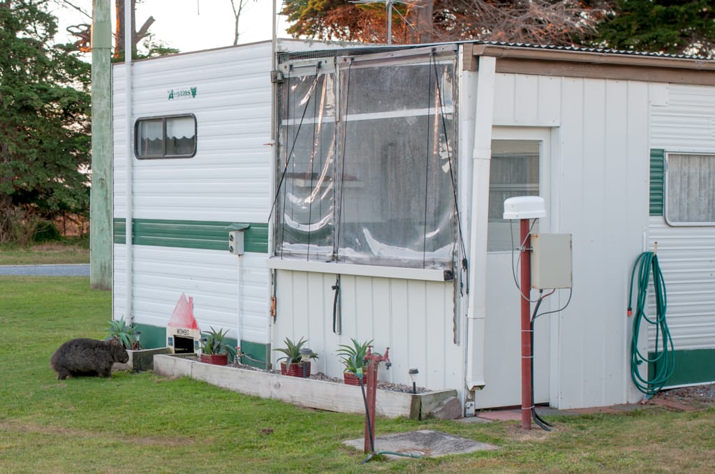 Zu Viert picknickten wir im City Park und liessen uns von den vielen japanischen Makaken-Affen unterhalten, die dort in einem grossen Gehege herumturnten, spielten und sich lausten. Danach fuhren wir an die Nordküste zum Narawantapu Nationalpark. In Kelso gabs einen Campingplatz, bei dem man viele Wildtiere sehen kann. Bereits beim Hineinfahren begrüsste uns ein Wombat, der von vorne wie ein kleiner Bär aussieht (von der Seite eher wie ein Hängebauchschwein). Bei einem kleinen Apéro-Spaziergang konnten wir weitere Wombats und Podemelons entdecken. Sobald es dunkel wurde, verwandelte sich der Platz in eine Spielwiese der Wildtiere. Es war besser als in einem Zoo! Beim 20 m WC-Gang begegneten mir über 10 Bushwallabies, ein Opossum und zwei Wombats. Martin und Cédric entdeckten einen Wombat mit einem Jungen im Beutel. Da der Beutel gegen hinten offen ist, guckte das Kleine beim Hinterteil heraus. Ein Dauercamper hatte selbst ein Loch gebuddelt, den Eingang herzig mit einem Häuschen bemalt und gewartet bis ein Wombat einzieht. Der Plan hatte funktioniert und momentan wohnt ein Weibchen mit seinem Jungen im Wombo-House.