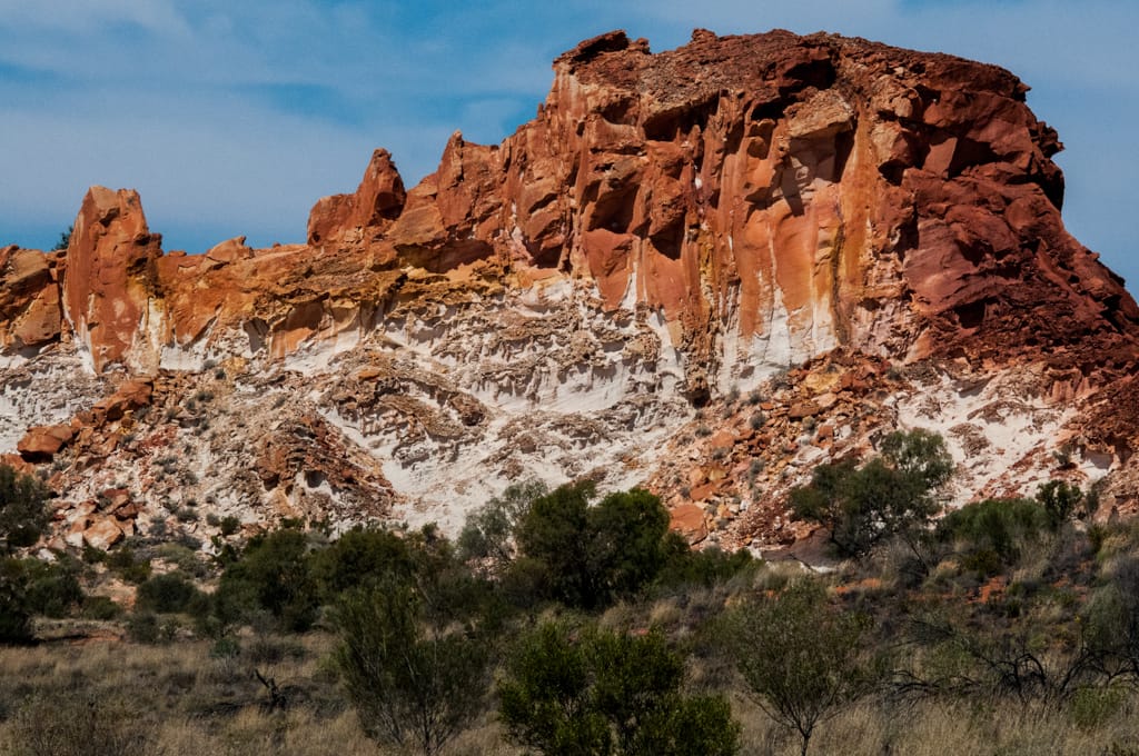 Zurück nach Alice Springs nehmen wir diesmal die kürzeste Route über asphaltierte Highways. Bei einer Tankstelle, bei der Emus gehalten werden, treffen wir auf ein Südafrikanisches-Deutsches Paar, das wir bereits in Mt. Isa kennengelernt hatten. Sie sind auch auf dem Rückweg nach Alice Springs und erzählen uns vom G’day Mate Campingplatz. Der sei günstiger als die anderen Campingplätze und habe auch alles inklusive Pool. Wir machen aber zuerst noch einen Abstecher ins Rainbow Valley. Abgesehen vom schönen Namen, haben wir gelesen, dass man Felsmalereien besichtigen könne. Eine unbefestigte Strasse, dich ich diesmal fuhr, brachte uns zu den farbigen Felsen, die aus braunen, roten, gelben und weissen Steinen bestehen. Wenn in der Regenzeit davor noch ein blauer See schimmert, weiss man sofort weshalb es Regenbogental heisst. So schön wie es auf den ersten Blick auch aussah, trübte sich die Stimmung sobald man das Auto verliess: die Fliegen sind auch hier! Unser Versuch draussen bei den schön angelegten Picknickplätze Mittag zu essen, scheitert kläglich. Das Spiegelei färbt sich sofort schwarz und es ist unmöglich etwas ohne Fliegen in den Mund zu nehmen. So verziehen wir uns ganz schnell ins heisse Auto, lassen den Motor und die Klimaanlage laufen. Für den Spaziergang bewaffnen wir uns mit den Kopffliegennetzen. Leider können wir keine Felsmalereien sehen. Die sind nur in geführten Touren zusammen mit Aborigines zugänglich. Beim Zurückfahren flitzt ein Dingo vor uns über die Strasse. Nach einer guten Autostunde erreichen wir zum zweiten Mal Alice Springs. Den empfohlenen Campingplatz finden wir schnell. Alle Plätze sind besetzt, aber wir können auf einem Stellplatz im hinteren Bereich unser Auto hinstellen.