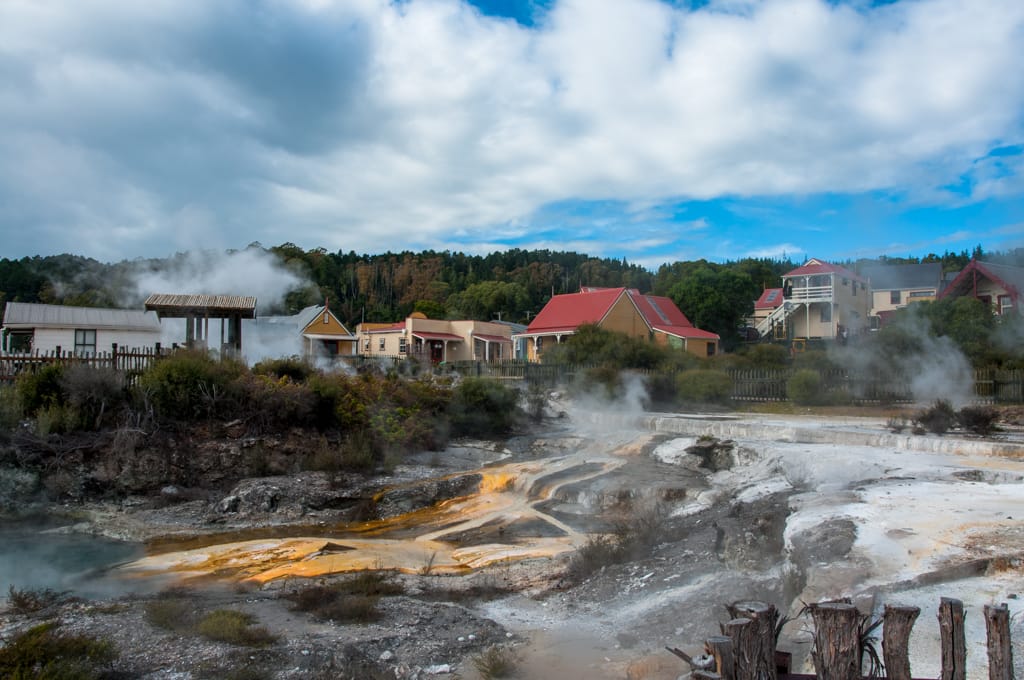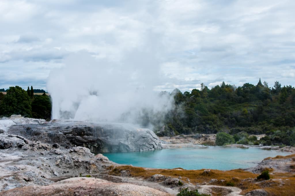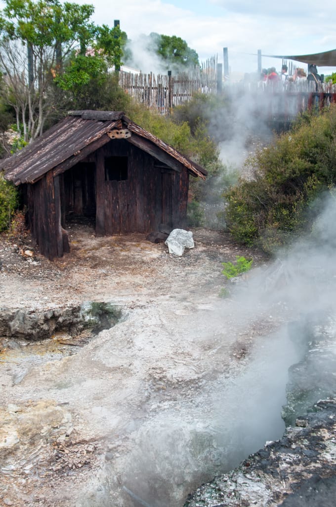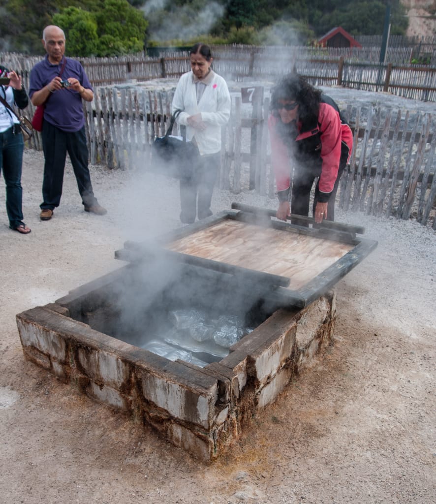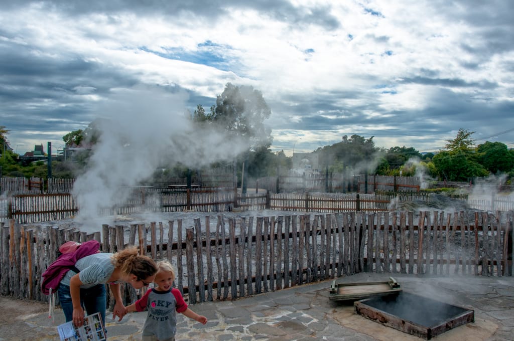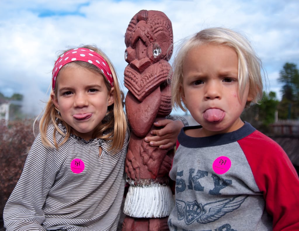 Für die 460 km nach Rotoura brauchten wir 6 Stunden. Es wurde also wieder ein langer Autofahrtag und wir waren froh, spielten die Kinder dieses straffe Programm so gut mit. Da wir bei der Vermietung nur Martin als Fahrer registriert hatten, musste er Neuseelands Strassen alle selbst fahren. Auf dem Zeltplatz im Vulkangebiet Rotoura konnten wir uns abends allerdings wunderbar in einem heissen, etwas schwefligen Thermalpool erholen. Der nächste Tag stand ganz im Zeichen der Maoris und den Schwefel- und blubbernden Schlammlöchern. Wir besuchten das lebendige Maori Dorf Whakarewarewa. Während einer Führung zeigte uns eine Maroni, wie Cédric sie nennt, wie sie das heisse Thermalwasser nützen um zu baden und zu kochen. Aus allen Erdlöchern stieg heisser Rauch aus, was der gesamten Umgebung ein spezielles Bild gab. Überall konnte man auch den stinkigen Schwefelgeruch riechen… Der Boden ist sehr warm hier, so dass man auch im Winter barfuss umhergehen kann (im Sommer wird’s jedoch unangenehm heiss hier). Es war sehr interessant und zum Abschluss gabs eine Maori Tanzvorstellung. Das ganze Dorf hatte eine sehr gute Mischung zwischen realem, heutigen Leben und touristischem, traditionellem gefunden. Das Hangi-Pie, den wir zum Zmittag dort assen, der direkt in einem Schwefelloch (natürlichen Steamer) gegart wurde, schmeckte köstlich. Bevor wir das Dorf verliessen erwachte noch ein Geysir, der sein Wasser mehrere Meter in die Höhe spuckte. Keine Frage, dieser Besuch löste nach Wellington ein weiteres grosses WOW in uns aus!