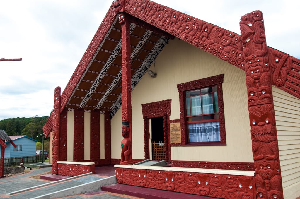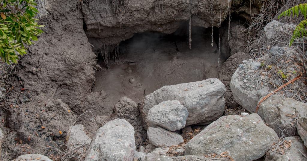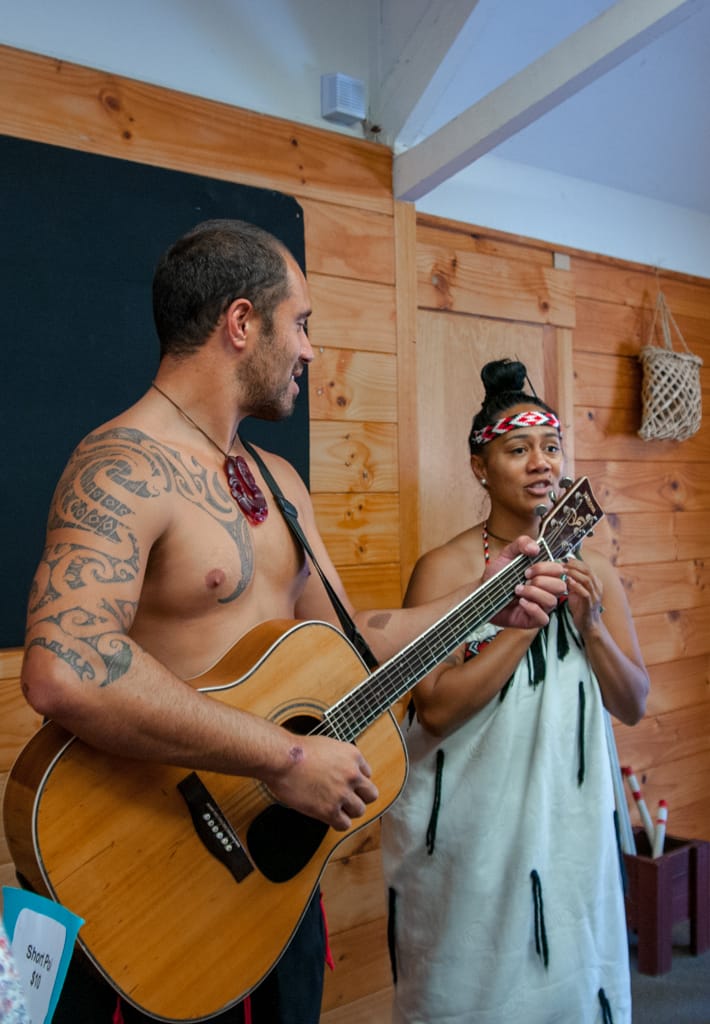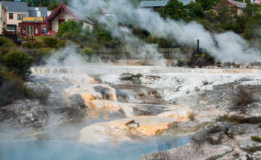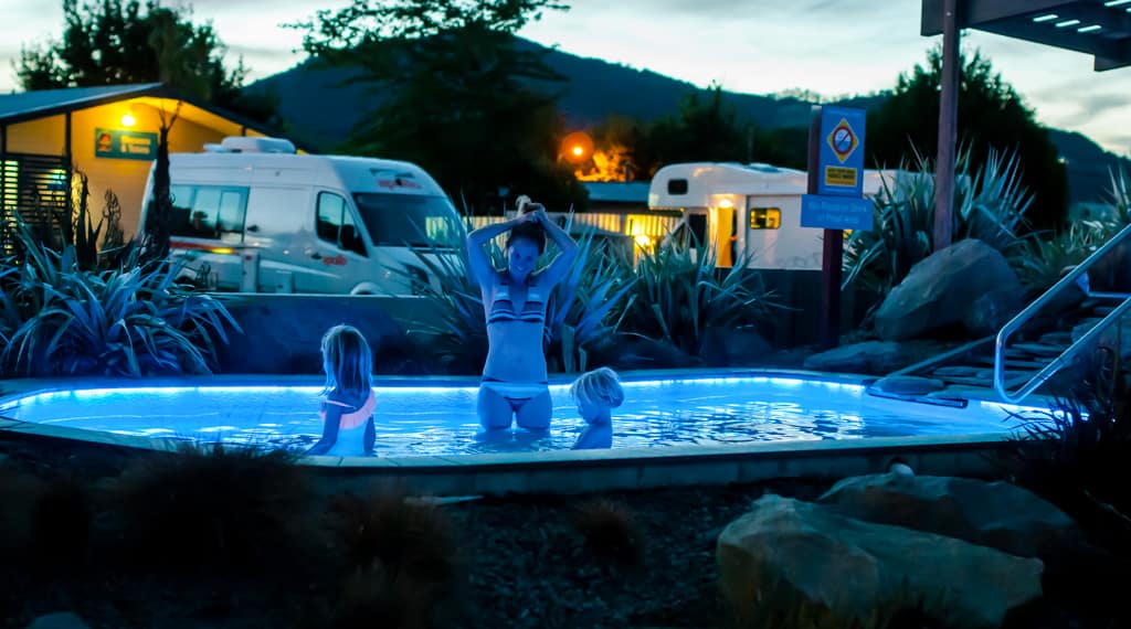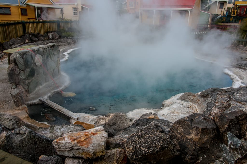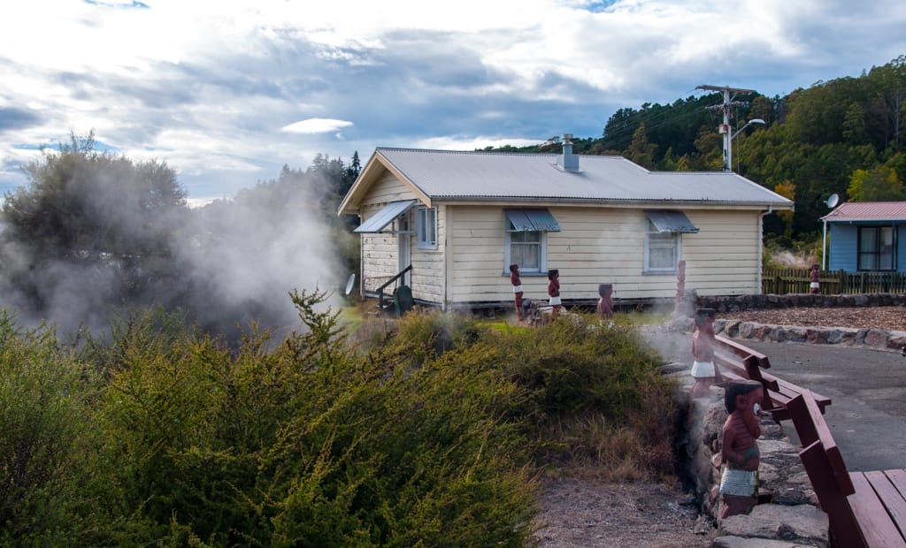 Für die 460 km nach Rotoura brauchten wir 6 Stunden. Es wurde also wieder ein langer Autofahrtag und wir waren froh, spielten die Kinder dieses straffe Programm so gut mit. Da wir bei der Vermietung nur Martin als Fahrer registriert hatten, musste er Neuseelands Strassen alle selbst fahren. Auf dem Zeltplatz im Vulkangebiet Rotoura konnten wir uns abends allerdings wunderbar in einem heissen, etwas schwefligen Thermalpool erholen. Der nächste Tag stand ganz im Zeichen der Maoris und den Schwefel- und blubbernden Schlammlöchern. Wir besuchten das lebendige Maori Dorf Whakarewarewa. Während einer Führung zeigte uns eine Maroni, wie Cédric sie nennt, wie sie das heisse Thermalwasser nützen um zu baden und zu kochen. Aus allen Erdlöchern stieg heisser Rauch aus, was der gesamten Umgebung ein spezielles Bild gab. Überall konnte man auch den stinkigen Schwefelgeruch riechen… Der Boden ist sehr warm hier, so dass man auch im Winter barfuss umhergehen kann (im Sommer wird’s jedoch unangenehm heiss hier). Es war sehr interessant und zum Abschluss gabs eine Maori Tanzvorstellung. Das ganze Dorf hatte eine sehr gute Mischung zwischen realem, heutigen Leben und touristischem, traditionellem gefunden. Das Hangi-Pie, den wir zum Zmittag dort assen, der direkt in einem Schwefelloch (natürlichen Steamer) gegart wurde, schmeckte köstlich. Bevor wir das Dorf verliessen erwachte noch ein Geysir, der sein Wasser mehrere Meter in die Höhe spuckte. Keine Frage, dieser Besuch löste nach Wellington ein weiteres grosses WOW in uns aus!